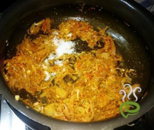 Heat oil in a pressure cooker. Add chopped onion and saute it for 5 minutes.