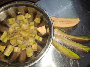 Peel and cut the banana into small cubes. Wash it repeatedly to get rid off the thick sap.