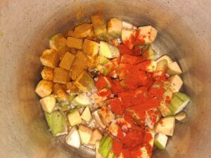 Add the washed banana pieces to the cooker and add chilly powder, turmeric powder and salt as required.