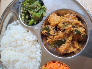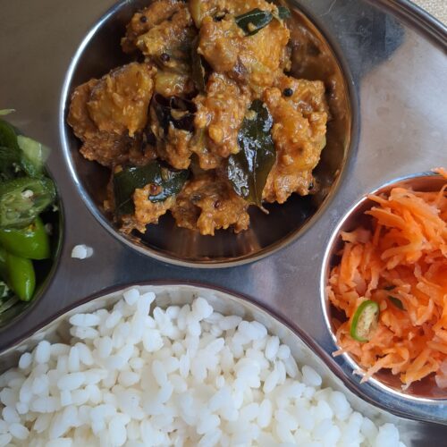 Finally, heat oil in a kadai and splutter mustard seeds. Add chopped shallots, curry leaves, dried red chilly and grated coconut .