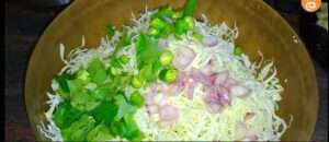 Chop finely the cabbage, green chillies and shallots. Take the ingredients: cabbage, green chillies, shallots and few curry leaves in a plate. Add required salt.