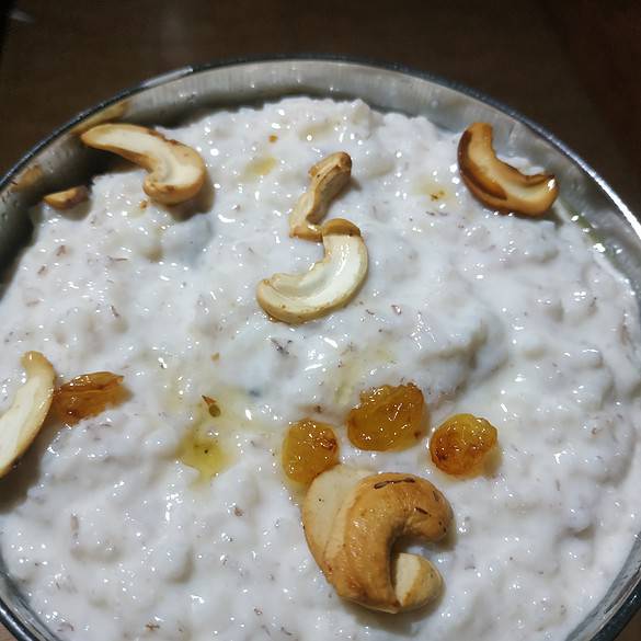 Heat ghee in a pan and fry cashew and raisins in it and pour it over the payasam.