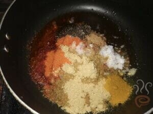 Place this on medium heat and the raw smell of all ingredients need to be gone. If you feel the mix is getting dry or sticking into the bottom, pour some more oil and mix it. Roast well till the colour changes. Then turn off the flame and and pour a cup of water into it.