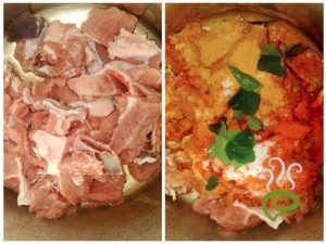 Add shallots and onion in the same oil and saute until golden brown in colour.Add crushed ginger garlic green chilly and saute until the raw smell goes off.