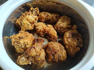 Dip the chicken pieces in the batter first. Then coat with flour.