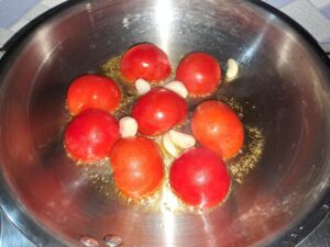 Rinse ripe tomatoes under running water and cut into two pieces. Then heat oil in a pan and place tomato pieces like shown in the picture.