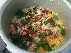 In this mean time add oil in other pan fry onion well keep aside then open pan sprinkle the fried onion and coriander leaves and mint leaves